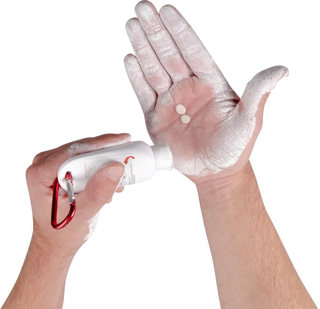 Tragen Sie eine kleine Menge der Flüssigkeit auf Ihre Hände oder Füße auf und lassen Sie sie kurz trocknen. Sie sind dann bereit für Ihr Training, ohne dass die Kreide abfärbt oder staubt.