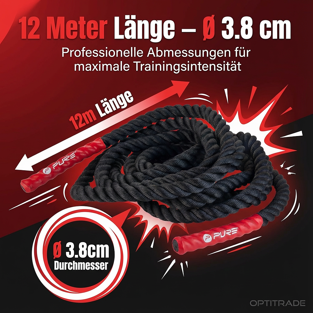 Dieses Trainingsseil wurde für höchste Beanspruchung konzipiert. Die robuste Konstruktion gewährleistet eine lange Lebensdauer, selbst bei täglichem, intensivem Gebrauch in Fitnessstudios oder im Home-Gym. Die Enden sind mit strapazierfähigen, roten Griffen versehen, die einen sicheren und rutschfesten Halt garantieren, selbst wenn Sie ins Schwitzen geraten.