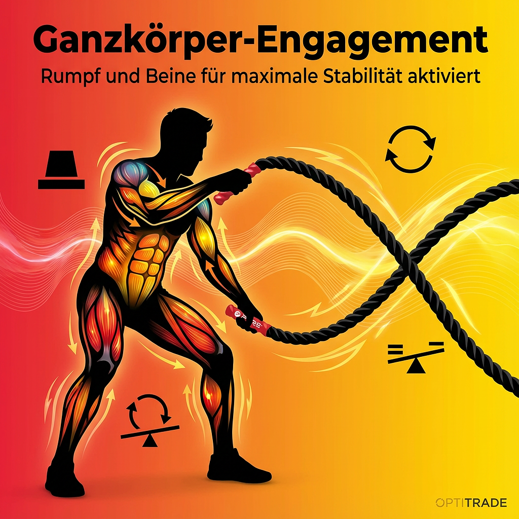 Obwohl der Fokus auf dem Oberkörper liegt, profitieren Sie von einem umfassenden Ganzkörpertraining. Ihre Beine und Ihr Rumpf sind ständig im Einsatz, um Stabilität zu gewährleisten und Sie fest auf dem Boden zu halten. Dies macht das Fitness Seil 12m zu einem der effektivsten Werkzeuge für funktionelle Fitness und zur Verbesserung der allgemeinen Körperkontrolle.