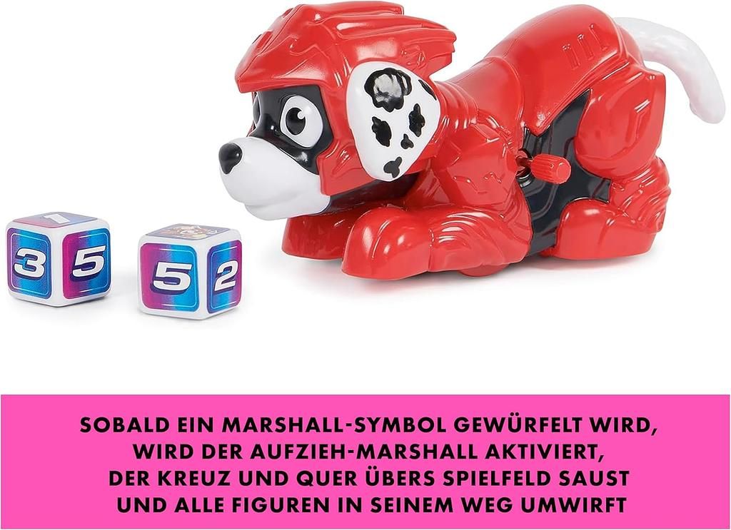 Doch Vorsicht! Sobald ein Marshall-Symbol gewürfelt wird, kommt der aufziehbare Marshall zum Einsatz – und fegt mit viel Wirbel und Chaos über das Spielfeld! Wer steht am Ende noch und schafft es, alle vier Figuren sicher in die Mitte zu bringen?