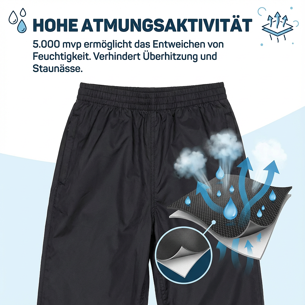 • Atmungsaktivität: Mit einer Atmungsaktivität von 5.000 mvp sorgen die Hosen dafür, dass Feuchtigkeit von innen nach außen entweichen kann. Dadurch wird ein angenehmes Tragegefühl gewährleistet, ohne dass die Kleinen von innen heraus nass werden.