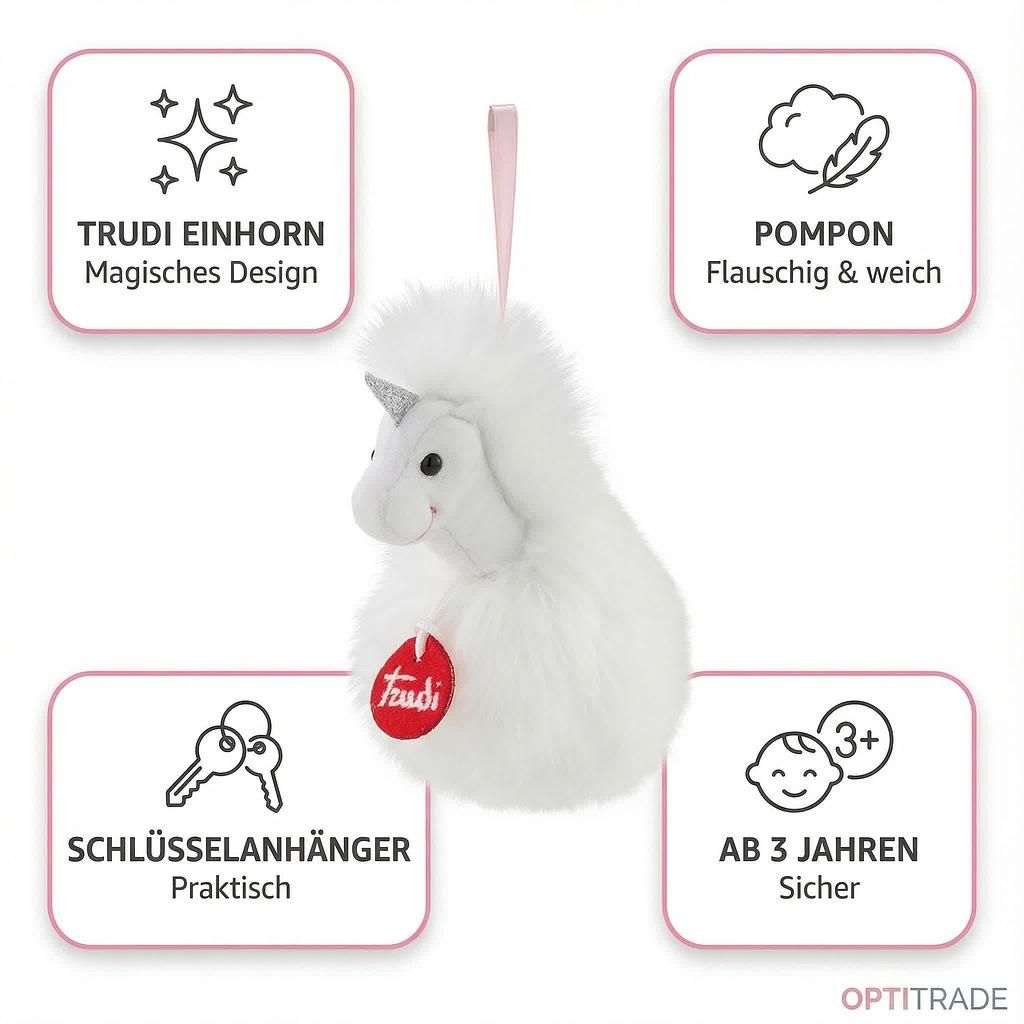 Entdecken Sie die bezaubernden Einhorn Pompons aus der neuen, farbenfrohen Kollektion von Trudi. Diese Plüschtier Schlüsselanhänger sind nicht nur ein Blickfang, sondern auch der perfekte Begleiter für Taschen, Rucksäcke oder Schlüsselbunde.
