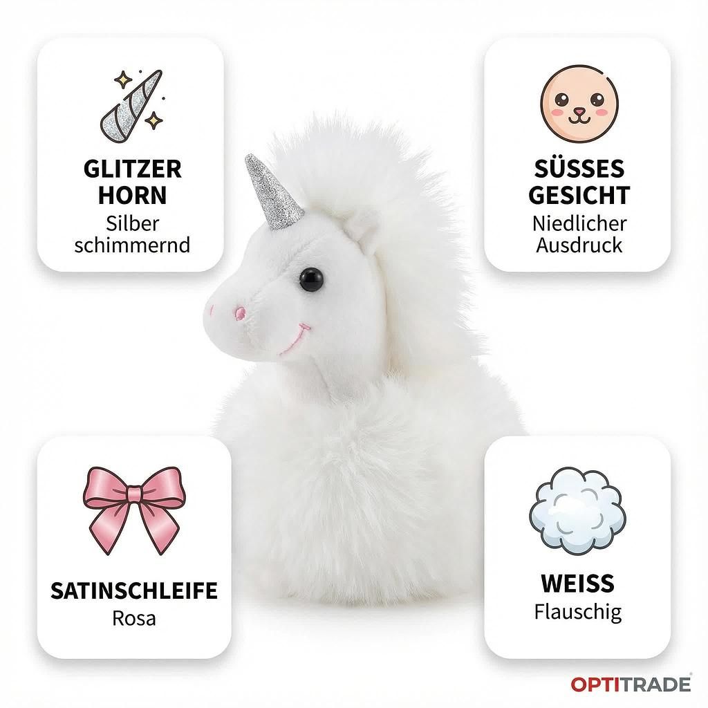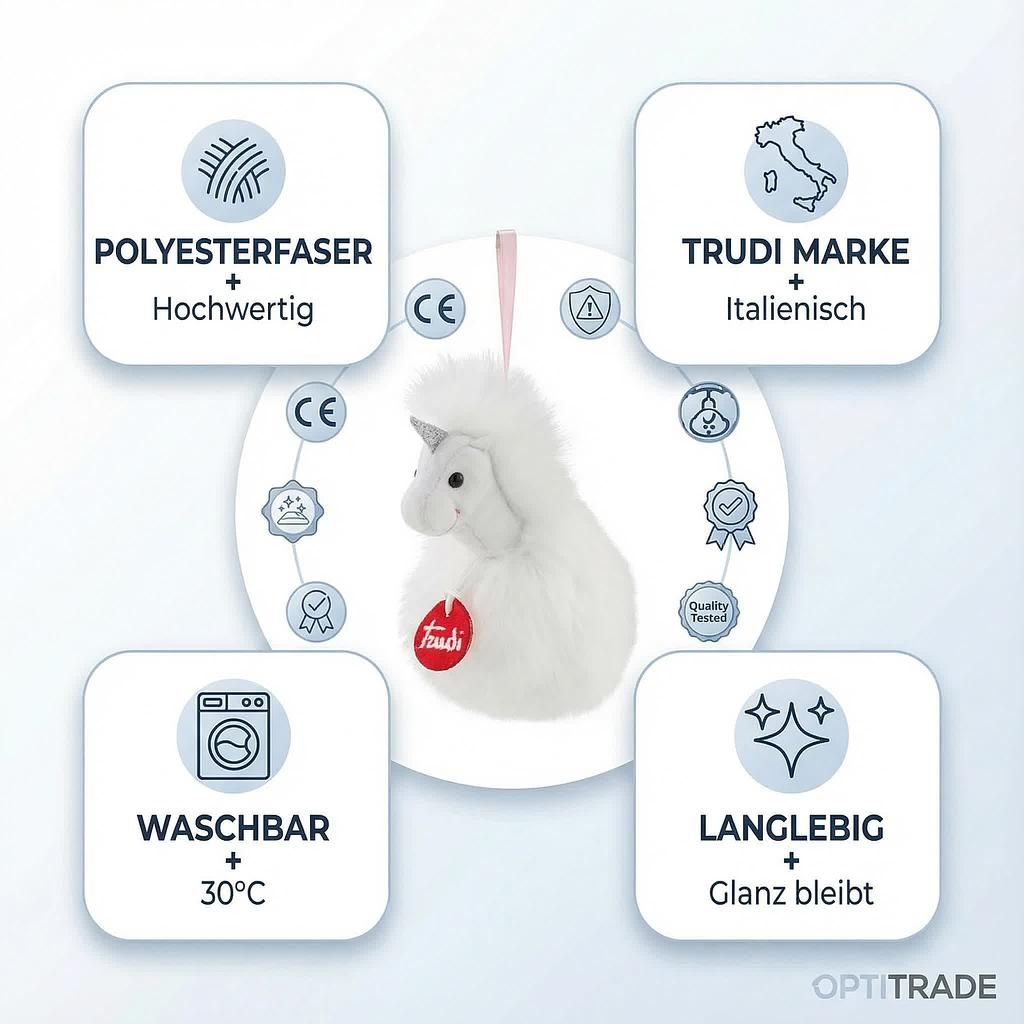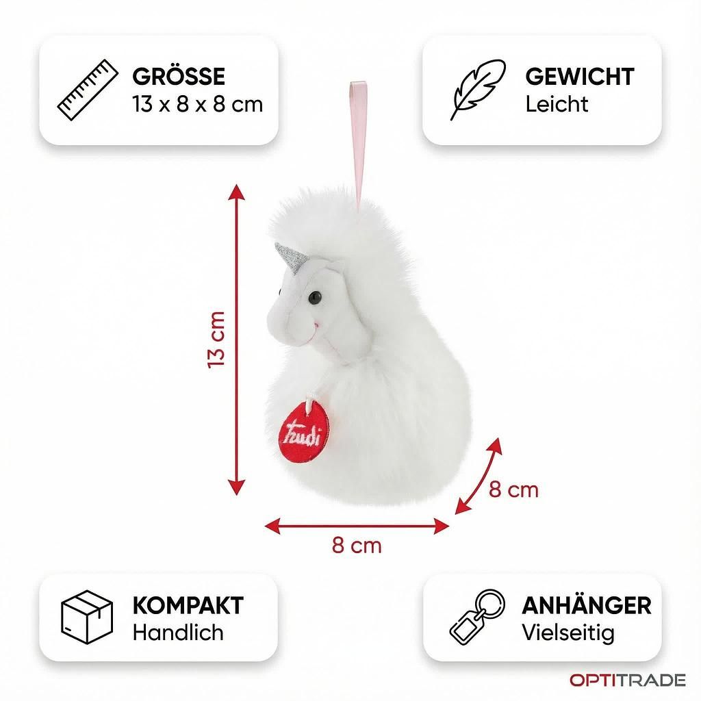 Jeder Trudi Anhänger besticht durch seinen süssen Gesichtsausdruck und die fantasievollen Mischungen aus langen Haaren und funkelnden Elementen. Die farblich perfekt abgestimmte Satinschleife unterstreicht das magische Design dieses Einhorn Plüschtier klein.